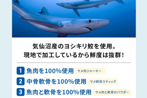 100%気仙沼産サメを使用したワンちゃんのおやつが新登場!!