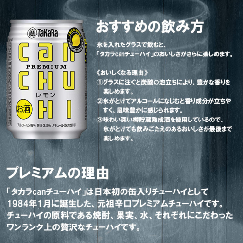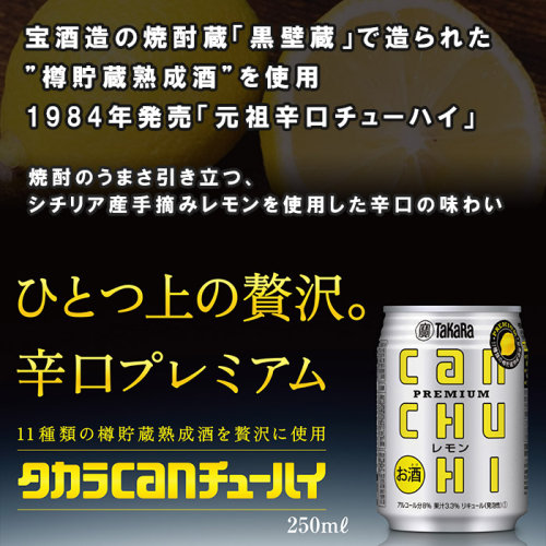 宝酒造の焼酎蔵「黒壁蔵」で造られた“樽貯蔵熟成酒”を使用! 1984年発売「元祖辛口チューハイ」 焼酎のうまさ引き立つ、シチリア産手摘みレモンを使用した辛口の味わい! \プレミアムの理由/ 「タカラcanチューハイ」は日本初の缶入りチューハイとして1984年1月に誕生した、元祖辛口プレミアムチューハイです。 チューハイの原料である焼酎、果実、水、それぞれにこだわったワンランク上の贅沢なチューハイです。 ☆おすすめの飲み方☆ 氷を入れたグラスで飲むと、「タカラcanチューハイ」のおいしさがさらに楽しめます! ------------------------- 原材料名 焼酎・レモン果汁・糖類・香料・紅花色素 保存方法 常温 ギフト対応 のし等のギフト対応をしておりません。ご了承ください。 備考 町内工場で造られた熟成酒を使用しています。 ※未成年者への酒類の販売は固くお断りしています。 【地場産品に該当する理由】 返礼品の主要部分をしめる甲類焼酎。原酒は全て区域内(宝酒造の工場「黒壁蔵」)で製造しているため。(告示第5条第2号に該当)