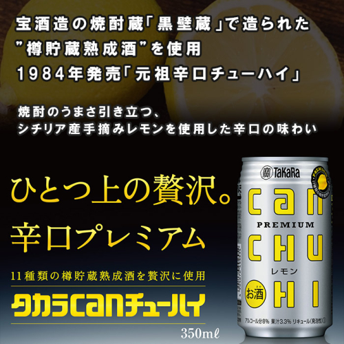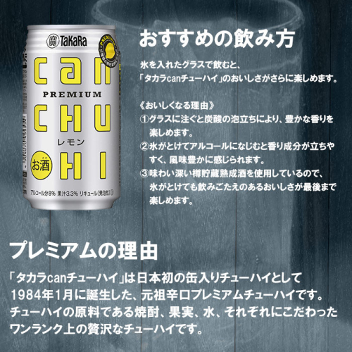 宝酒造の焼酎蔵「黒壁蔵」で造られた“樽貯蔵熟成酒”を使用! 1984年発売「元祖辛口チューハイ」 焼酎のうまさ引き立つ、シチリア産手摘みレモンを使用した辛口の味わい! \プレミアムの理由/ 「タカラcanチューハイ」は日本初の缶入りチューハイとして1984年1月に誕生した、元祖辛口プレミアムチューハイです。 チューハイの原料である焼酎、果実、水、それぞれにこだわったワンランク上の贅沢なチューハイです。 ☆おすすめの飲み方☆ 氷を入れたグラスで飲むと、「タカラcanチューハイ」のおいしさがさらに楽しめます! ------------------------- 原材料名 焼酎・レモン果汁・糖類・香料・紅花色素 保存方法 常温 ギフト対応 のし等のギフト対応をしておりません。ご了承ください。 備考 町内工場で造られた熟成酒を使用しています。 ※未成年者への酒類の販売は固くお断りしています。 【地場産品に該当する理由】 返礼品の主要部分をしめる甲類焼酎。原酒は全て区域内(宝酒造の工場「黒壁蔵」)で製造しているため。(告示第5条第2号に該当)