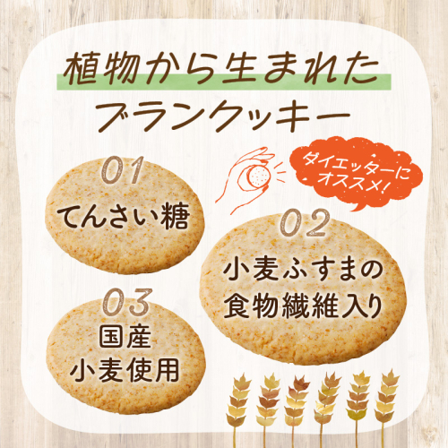 植物から生まれたクッキーです。てんさい糖でのシンプルな味付のため噛むほどに素材の味を楽しめます。食感と素材のハーモニーを是非ご賞味ください。 ブランとは小麦のふすま(外皮)のことです。ここには日常ではとりにくい食物繊維が約40%含まれています。 ☆ブランクッキーをおいしく食べるには・・・☆ ・牛乳と一緒に ・ジャムをのせて ・ヨーグルトをのせて 【原材料】 小麦粉(国内製造)、砂糖(てんさい糖)、ショートニング(パーム油、米油)、小麦ふすま、全粒粉、コーンスターチ、食塩/膨脹剤(重曹)、(一部に小麦を含む) ※ 卵、乳成分を含む製品と共通の設備で製造しています。 【地場産品に該当する理由】 原材料仕入から最終工程まですべて区域内で行うことにより、相応の付加価値が生じているもの。