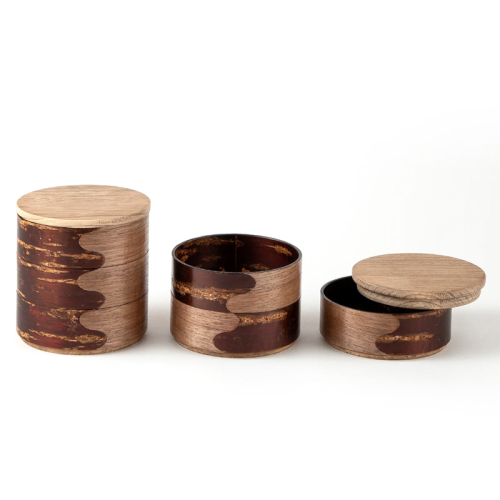 ★樺細工のハイブリットケース ヤマザクラ樹皮とウオールナットの突板をフィンガージョイントして筒状にしています。これまでジョイント部分のデザインは直線的なものが多かったのですが、このBUCHIシリーズでは自然の営みを感じさせる、より有機的な形状のジョイントとしました。 そして更に異素材のフィンガージョイントが美しいコントラストを生み出し、木のぬくもりが感じられる仕上がりになっています。三段に分かれる筒は小物入れとして、そして朝・昼・晩の薬入れとしても使用できます。 ■ 秋田県 仙北市 ■ 伝統工芸品 山桜 ヤマザクラ 桜皮 樺細工 かばざいく カバザイク