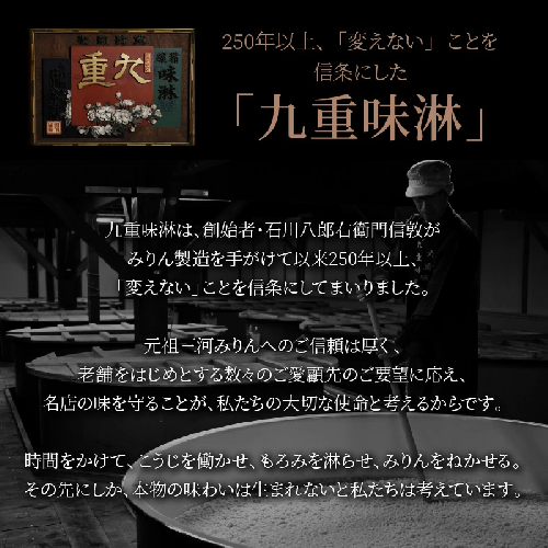 江戸時代の創業当時から今に受け継がれる昔ながらの製法で、手間隙かけてじっくりと醸造した本みりんです。もち米だけで作られる自然な甘みと豊富なうま味は格別で、料理をよりいっそうおいしく仕上げます。