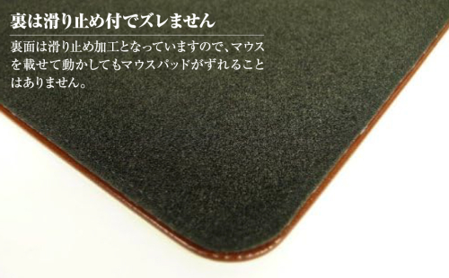 エッジ(縁)は革の切断面を見せない丁寧なへり返し仕上げとなっており、パソコンショップで販売されているありきたりなマウスパッドとは一味違う、豪華さを醸し出しています。裏面は滑り止め加工となっていますので、マウスを載せて動かしてもマウスパッドがずれることはありません。是非、この本革マウスパッドを使って、一味違ったパソコンライフをお楽しみください。