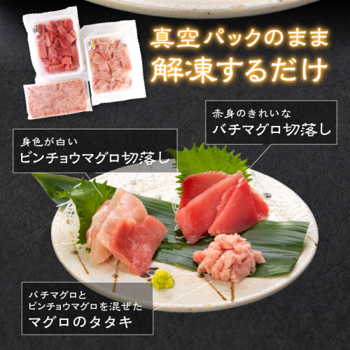 【説明】赤身のきれいなバチマグロ、身色が白いビンチョウマグロ、バチマグロとビンチョウマグロを混ぜたマグロのタタキをセットにしました。マグロ切落とし、タタキとも真空パックになっているので冷水で解凍すればすぐに食べられます。また、養殖・味付け・加工に力を入れたうなぎ長焼きはふっくらで柔らかく、お箸でも切れやすいので是非ご賞味下さい。