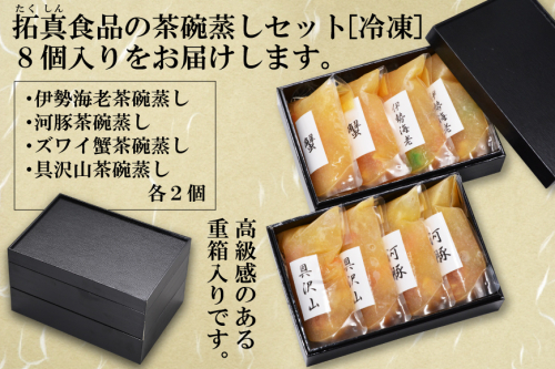 拓真食品の茶碗蒸しセット(伊勢海老・河豚・ズワイ蟹・具沢山)8個分をお届けします。