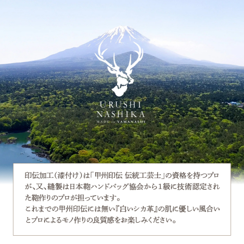 「URUSHINASHIKA」(ウルシナシカ)は、「漆」「山梨」「鹿」を意味する言葉で山梨県が商標登録したブランドです。 「甲州印伝」はシカ革の上に漆で紋様を付ける山梨県を代表する伝統工芸品の一つですが、その革は中国から輸入されたキョンの皮が使われています。 一方山梨県内では野生のニホンジカによる農作物への被害が深刻化していてその対策として一定数を捕獲していますが、その皮の殆どは廃棄されています。 私たちはこの皮を有効活用しようと山梨県、富士河口湖町と同町内にあるシカ処理場の協力を得て「URUSHINASHIKA」(ウルシナシカ)プロジェクトを立ち上げました。 この皮を印伝製品用として使えるようにするために、兵庫県の革鞣し会社と共同研究開発チームを作り、SDGs時代に相応しい有害物質を一切使わない方法で出来た環境に優しい革、土に還る革を開発しました。 印伝加工(漆付け)は「甲州印伝 伝統工芸士」の資格を持つプロが、又、縫製は日本鞄ハンドバッグ協会から1級に技術認定された鞄作りのプロが担っています。 これまでの甲州印伝には無い『白いシカ革』の肌に優しい風合いとプロによるモノ作りの良質感をお楽しみください。 ※素材:富士河口湖町で捕獲されたニホンジカの皮+イタリアンレザー ※画像はイメージです。