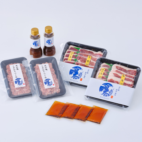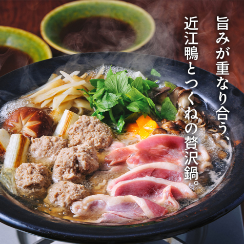 滋賀県初の国産合鴨ブランド「近江鴨」と近江鴨のこだわりつくねに「鍋つゆ」「オリジナル香味たれ」がついた鴨鍋セット。
