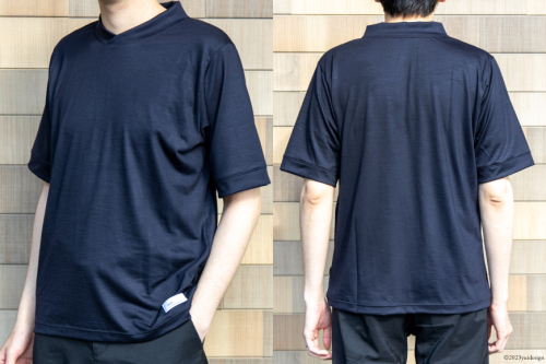 また、首回りの部分を通常のカットソーより、1.3倍大きくし、ジャケットを合わせた時に襟裏に肌が直接当たらないように設計されているため、襟裏の汚れを軽減できる仕様です。
