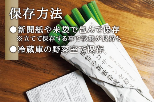 ネギの到着後は、新聞紙で包んだり、米袋に入れる等して乾燥しないように、涼しい場所で保管してください。また、ビニール袋などの気密性の高いもので密封するのはお控えください。なお、ネギは立てて保管すると状態の良さが長持ちします。冷蔵庫の野菜室で保管するのもオススメです。
