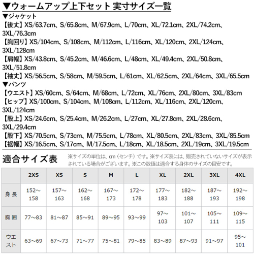 《ウォームアップ上下セット 実寸サイズ一覧》