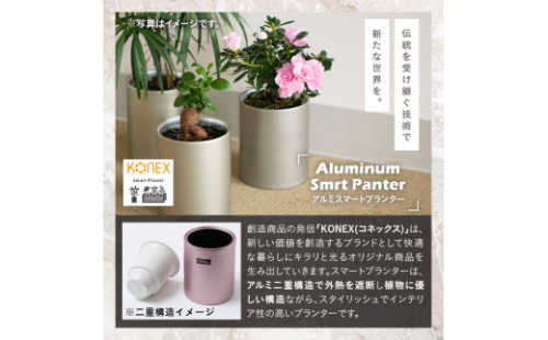 「伝統を受け継ぐ技術で新たな世界を」 照明器具の製造で培った加工技術で新たなモノづくりを。 創造商品の発信「KONEX(コネックス)」は、新しい価値を創造するブランドとして快適な暮らしにキラリと光るオリジナル商品を生み出していきます。 スマートプランターは、アルミ二重構造で外熱を遮断し植物に優しい構造ながら、スタイリッシュでインテリア性の高いプランターです。 《カラー》 ・クロンダイク グリーン(SP-4-KG-BK) 《サイズ》 4号 サイズ(mm):直径125×高さ150 国分電機通商株式会社 0995-47-3311 《地産理由》市内で製造した製品