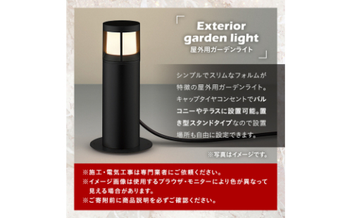 シンプルでスリムなフォルムが特徴の屋外用ガーデンライト。 キャップタイヤコンセントでバルコニーやテラスに設置可能。 置き型スタンドタイプなので設置場所も自由に設定できます。 ※施工・電気工事は専門業者にご依頼ください。 ※イメージ画像は使用するブラウザ・モニターにより色が異なって見える場合があります。 《カラー》 ・ブラック(AU51350) 《商品詳細》 W数:40W相当 ランプ:LED電球40形相当(E26) 本体:アルミ セード:アクリル・乳白色 ・地上高-297 上幅-φ90mm 下幅-φ150mm 重-1.8kg ・光源寿命:40,000時間 ・キャブタイヤケーブル5.0m付 ・調光器併用不可 ・7VA(100V) ●防雨型 ●ねじ込式 ●プラグ付 国分電機通商株式会社 0995-47-3311 《地産理由》市内で製造した製品