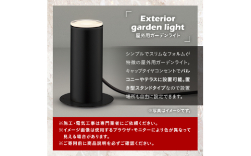 シンプルでスリムなフォルムが特徴の屋外用ガーデンライト。 キャップタイヤコンセントでバルコニーやテラスに設置可能。 置き型スタンドタイプなので設置場所も自由に設定できます。 ※施工・電気工事は専門業者にご依頼ください。 ※イメージ画像は使用するブラウザ・モニターにより色が異なって見える場合があります。 《カラー》 ・ブラック(AU51413) 《商品詳細》 W数:40W相当 ランプ:LED電球60形相当(E17) 本体:アルミ セード:アクリル・乳白色 ・地上高-223 上幅-φ90mm 下幅-φ150mm 重-1.6kg ・光源寿命:40,000時間 ・キャブタイヤケーブル5.0m付 ・調光器併用不可 ・12VA(100V) ●防雨型 ●ねじ込式 ●プラグ付 国分電機通商株式会社 0995-47-3311 《地産理由》市内で製造した製品