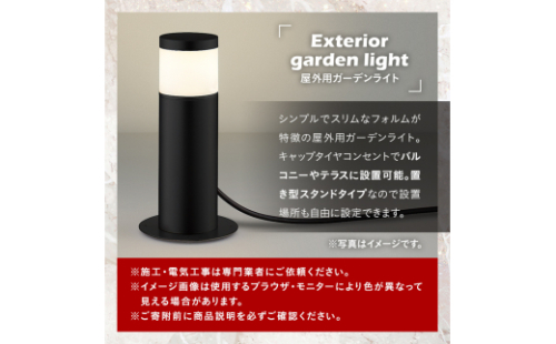 シンプルでスリムなフォルムが特徴の屋外用ガーデンライト。 キャップタイヤコンセントでバルコニーやテラスに設置可能。 置き型スタンドタイプなので設置場所も自由に設定できます。 ※施工・電気工事は専門業者にご依頼ください。 ※イメージ画像は使用するブラウザ・モニターにより色が異なって見える場合があります。 《カラー》 ・ウォームシルバー(AU51436) 《商品詳細》 W数:60W相当 ランプ:LED電球40形相当(E26) 本体:アルミ セード:アクリル・乳白色 ・地上高-297 上幅-φ90mm 下幅-φ150mm 重-1.6kg ・光源寿命:40,000時間 ・キャブタイヤケーブル5.0m付 ・調光器併用不可 ・7VA(100V) ●防雨型 ●ねじ込式 ●プラグ付 国分電機通商株式会社 0995-47-3311 《地産理由》市内で製造した製品