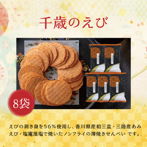 えびの剥き身を56%使用し、香川県産和三盆・三陸産あみえび・塩竃藻塩で焼いたノンフライの薄焼きせんべい