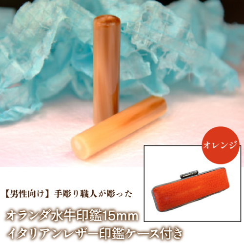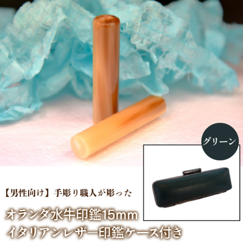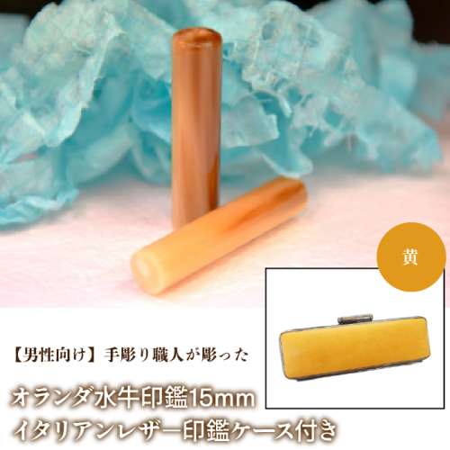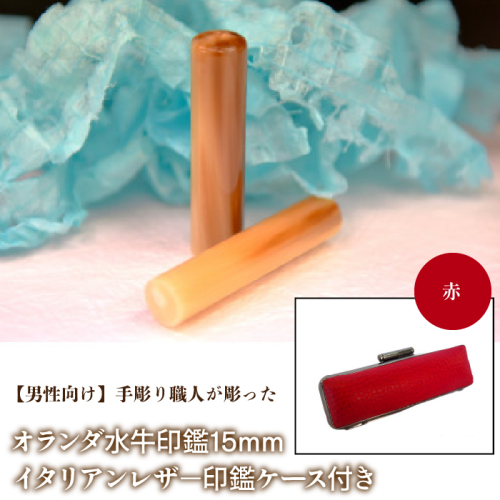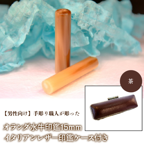 【男性向け】手彫り職人が彫ったオランダ水牛印鑑15mm イタリアンレザ−印鑑ケース付き FCH007