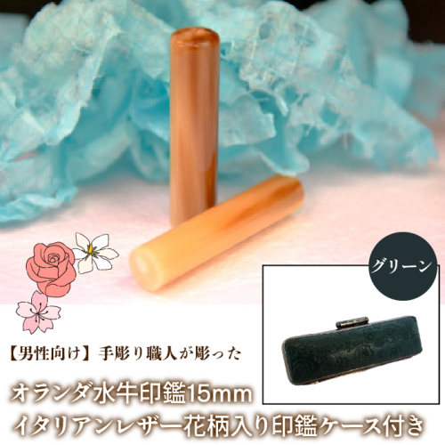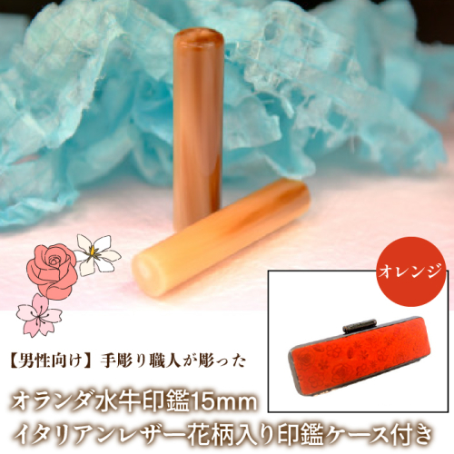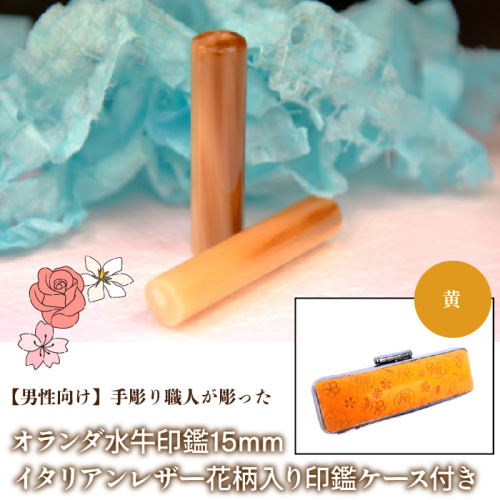 【男性向け】手彫り職人が彫ったオランダ水牛印鑑15mm イタリアンレザ−花柄入り印鑑ケース付き FCH008