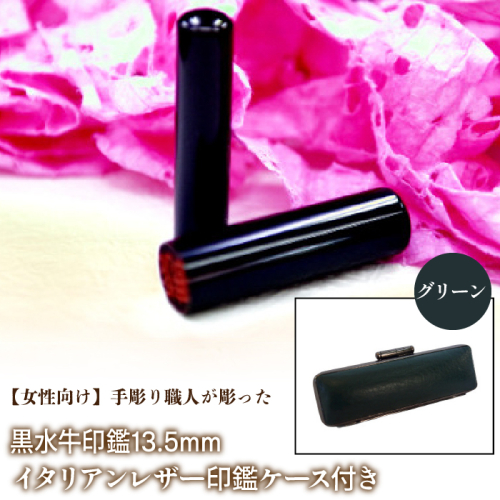 【女性向け】手彫り職人が彫った黒水牛印鑑13.5mm イタリアンレザ−印鑑ケース付き FCH011