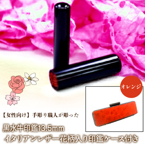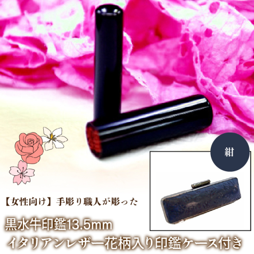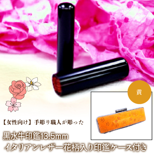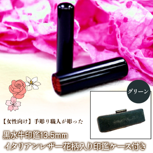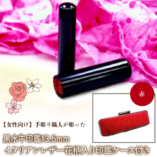 【女性向け】手彫り職人が彫った黒水牛印鑑13.5mm イタリアンレザ−花柄入り印鑑ケース付き FCH012