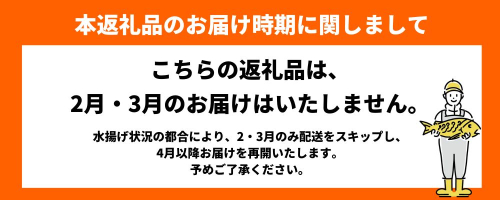 ※水揚げ状況の都合により、2・3月のみ配送をスキップし、4月以降お届けを再開いたします。( そのため、配送月は 1月・4月・5月・6月・7月・8月 となります)