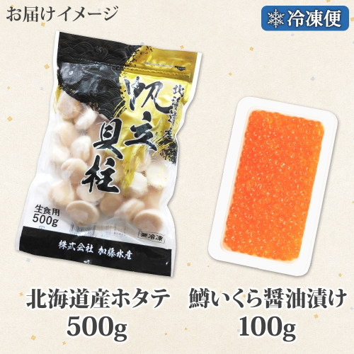 3613. 訳あり ホタテ 500g 鱒いくら醤油漬け 100g 訳アリ ほたて 帆立 貝柱 鱒いくら いくら イクラ 醤油漬け マス 海鮮 海鮮丼 セット 送料無料 北海道 弟子屈町