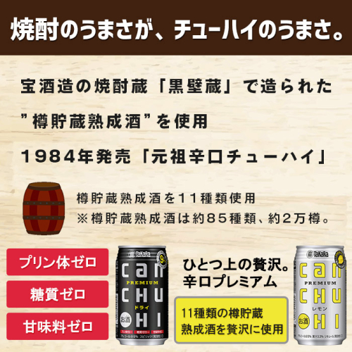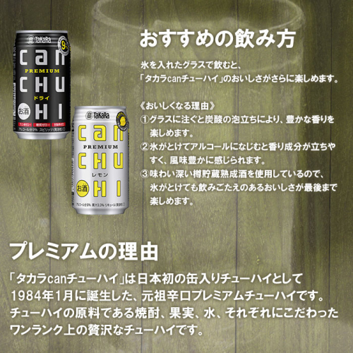 宝酒造の焼酎蔵「黒壁蔵」で造られた“樽貯蔵熟成酒”を使用! 1984年発売「元祖辛口チューハイ」 「ドライ」「レモン」の2種セットです! \プレミアムの理由/ 「タカラcanチューハイ」は日本初の缶入りチューハイとして1984年1月に誕生した、元祖辛口プレミアムチューハイです。 チューハイの原料である焼酎、果実、水、それぞれにこだわったワンランク上の贅沢なチューハイです。 ☆おすすめの飲み方☆ 氷を入れたグラスで飲むと、「タカラcanチューハイ」のおいしさがさらに楽しめます! ------------------- 原材料名 【タカラcanチューハイ ドライ】焼酎・レモン・グレープフルーツ・香料 【タカラcanチューハイ レモン】焼酎・レモン果汁・糖類・香料・紅花色素 保存方法 常温 ギフト対応 のし等のギフト対応をしておりません。ご了承ください。 備考 町内工場で造られた熟成酒を使用しています。 【地場産品に該当する理由】 返礼品の主要部分をしめる甲類焼酎。原酒は全て区域内(宝酒造の工場「黒壁蔵」)で製造しているため。(告示第5条第2号に該当)