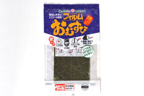 おむすび用にカットしたのりをコンビニタイプの縦割れフイルムに入れております。