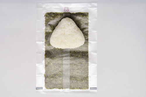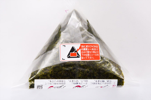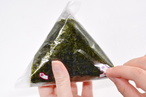 おむすびを包んで、食べる直前にフィルムをワンカットで縦方向に外し、いつでものりがパリパリとした食感のおむすびをお楽しみいただけます。