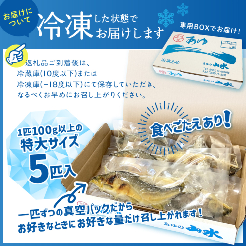 名水百選の綾川の伏流水を使用し、自然に近い状態で養殖した鮎を香ばしく塩焼きにしたものを冷凍で届けします。 上品で爽やかな食味・風味があるところから別名「香魚」と呼ばれる「鮎」をぜひご賞味ください。 1匹100g以上の特大サイズを5匹入れてありますので、食べ応えは十分にあります!! 1箱5匹入り山水自慢のあゆの塩焼きを是非ご堪能ください。 ■あゆの山水 創業昭和44年、照葉樹林が広がる綾川渓谷の入り口に位置し「あゆ処」として鮎の塩焼きや甘露煮、うるかなどを提供しています。 綾川の自然水が流れ込む養殖池では、水カマキリやゲンゴロウが生息し、天然に近い環境のもとで鮎の養殖を行っています。 【地場産品に該当する理由】 当該地方団体の区域内において返礼品等の原材料の主要な部分が生産されたものであること〈告示第五条第二号に該当〉