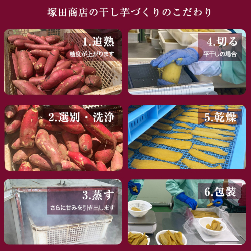 干し芋は自然食品の為、同一品種でも収穫時期、天候等により、大きさ、形、硬さ等に違いが出てしまう事があります。