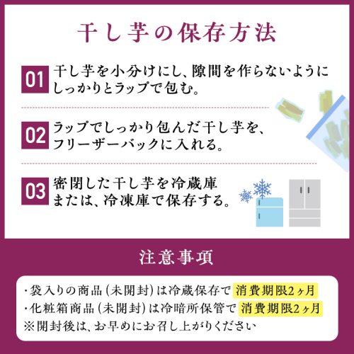 適切な環境で長期間保管して糖化させることにより甘くなったさつま芋を干し芋に加工してお届けするように務めております。