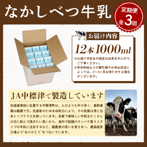 【定期便:全3回】なかしべつ牛乳1L×12本 牛乳 ミルク 乳製品 乳飲料 健康 朝食 高栄養 国産 お取り寄せ 定期便 3ヶ月 ふるさと納税 北海道 中標津町 中標津