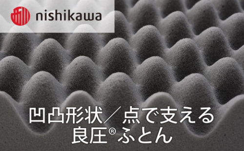 良圧ふとんは、西川でも長く愛用されてきた体圧の分散をする凹凸構造で、独自のストレスフリーウェーブ構造。体圧分散と寝姿勢保持をすることで、快適な睡眠をお届けします。