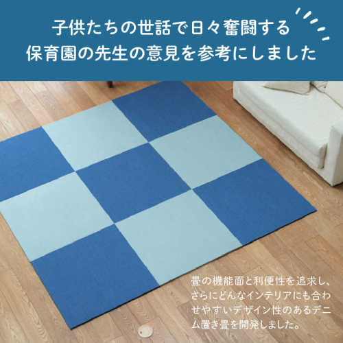 保育園で働く保育士の意見をもとに、畳の機能面と利便性を追求し、さらにどんなインテリアにも合わせやすいデザイン性のあるデニム置き畳を開発しました。