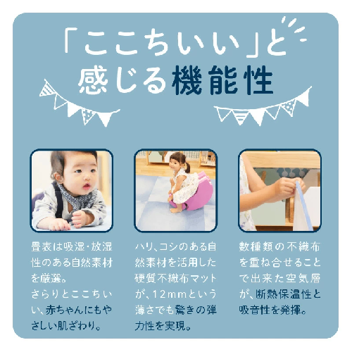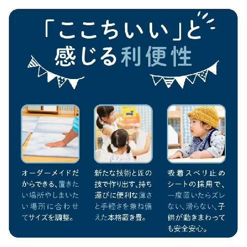 保育園で働く保育士の意見をもとに、畳の機能面と利便性を追求し、さらにどんなインテリアにも合わせやすいデザイン性のあるデニム置き畳を開発しました。