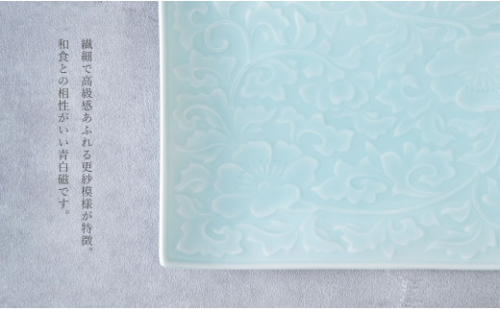 繊細で高級感あふれる更紗模様が特徴の銘々皿です。 青白磁は和食との相性がとても良く、取り皿やちょっとした盛り皿として食卓を華やかに彩ってくれる他、 水色の濃淡の表現がとても美しいことから、来客時の和菓子のお皿としてもお使いいただけます。 青磁の中でも色合いが薄いことで、盛り付ける料理やお菓子を優しく引き立ててくれます。 専用の化粧箱でお届けしますので大切な方への贈り物としてもおすすめです。                                      窯元:貝山窯