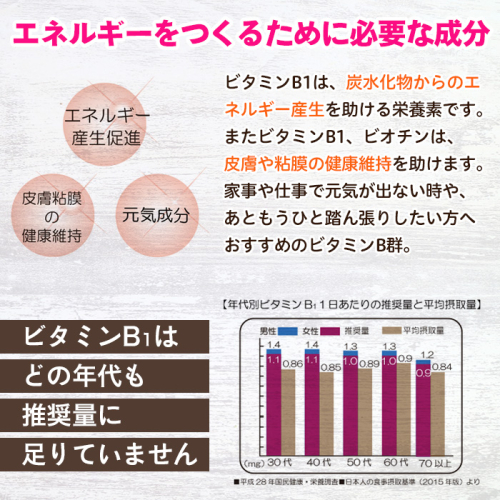 日々の家事や仕事で元気が出ない時はもちろん、あともう少し踏ん張りたい時の【緑の下の力持ち】として、ビタミンB群に含まれる元気成分ビタミンB1がお手伝いします。その他にもB1以外のB2、B6、B12、ナイアシン、パントテン酸、葉酸、ビオチンも含まれており、一緒に摂ることができます。