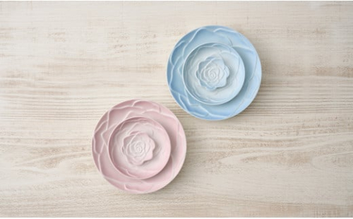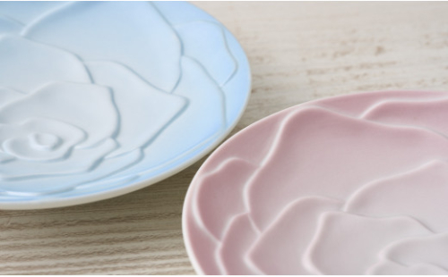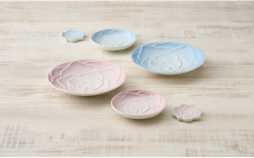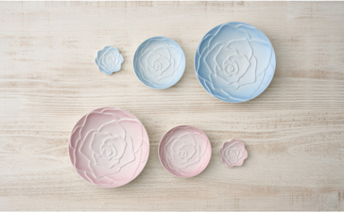 バラの取り皿・小皿・箸置きの各2点、合計6点のセットです。 取り皿は一番使いやすいサイズを追求し、おもてなしやハレの日はもちろん、 普段使いにも、その使いやすさでヘビロテ必須アイテムです。 小皿は大きいプレートの上に置いたり、角砂糖や金平糖を入れてテーブルに並べるだけでも テーブルが華やぎます。 箸置きは少し大きめですが、カトラリーレストとしてもお使いいただけるようにしました。 どちらの商品も内側にバラの刻印を施し、立体的な食器になっています。 カラーはふわふわマシュマロカラーのピンクとブルーの2色です。 提供:株式会社錦右エ門陶苑