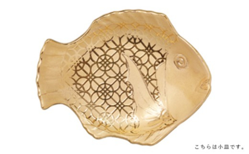 【いろいろな形のお皿特集】 明治の頃より家運が「右肩上がりに良くなるように」と願いを込めて作っている「右向きの鯛」です。 文様は高級織物とされる「佐賀錦」をモチーフに金で格調高く仕上げました。 大きさの違うお皿でお楽しみいただけます。  「佐賀錦」は佐賀県で最も高級とされる伝統織物。 貴族階級の間で作られたこともあり、幕府に献上された格式あるものです。 その精緻なイメージをもとにデザインした柄に本物の「金」を使い、鯛皿に焼き付けました。 上品な輝きと華やかさは見ているだけでも心豊かに。 上質で格調高いご縁が招かれることでしょう。           窯元:梶謙製磁社