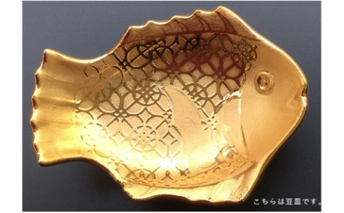 その精緻なイメージをもとにデザインした柄に本物の「金」を使い、鯛皿に焼き付けました。