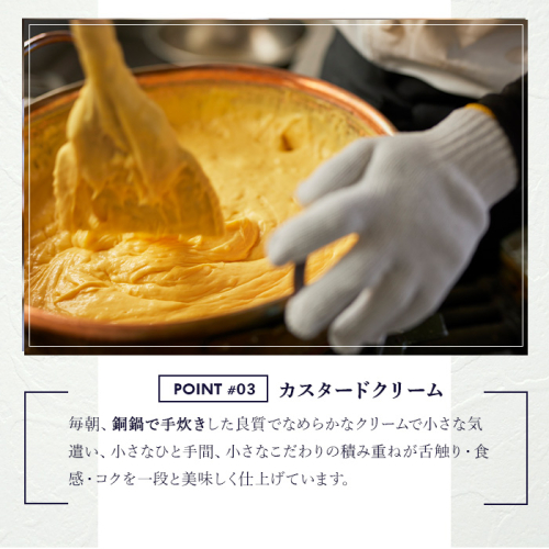 サクサク焼き立ての生地に朝一手炊きの特製カスタードクリームを詰め、急速冷凍しております。 出来立ての美味しさをぜひご賞味ください。 保存方法:冷凍 生菓子ですので、冷蔵庫にて保管され、解凍後はその日のうちにお召し上がりください。 (完全冷凍状態のものの冷蔵庫による解凍時間は約8時間〜10時間です。) 地場産品基準類型3:当該地方団体の区域内において返礼品等の製造、加工その他の工程のうち主要な部分を行うことにより相応の付加価値が生じているもの。