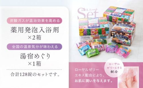 炭酸ガスが温浴効果を高める「薬用発泡入浴剤」2つと手軽に全国の温泉気分が味わえる「湯宿めぐり」1つの128錠セットです。