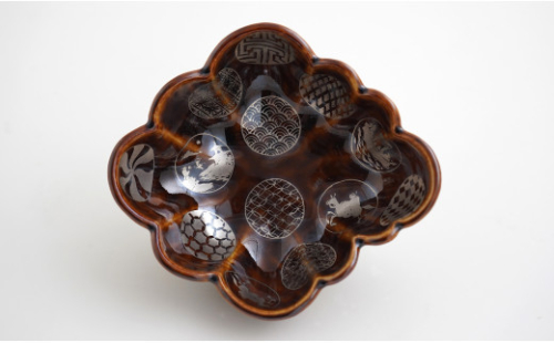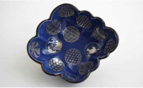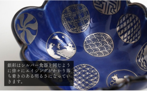 木瓜型の器に呉須を塗られたものと飴色の釉薬をかけたもの、それぞれ贅沢に銀彩の様々な丸紋を施された、 どの角度から見ても美しい木瓜型小鉢です。 ■銀彩はシルバー食器と同じように徐々に使用の頻度や状況で、時間の経過とともに ゆっくりとエイジングがかかり落ち着きのある明るさになっていきます。 お手持ちの重曹や銀磨きなどで銀彩の明るさは元に戻すことも可能です。 お好みでエイジングを楽しむ事が出来る器です。 窯元:福泉窯 提供:渕上陶磁器 FUCHIGAMI TOJIKI