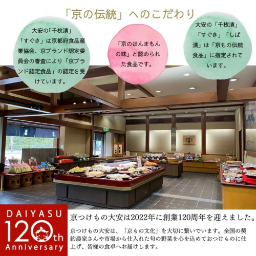 信頼する契約農家で丹精込めて育てられた伝統京野菜「聖護院かぶら」を北海道産昆布と下漬・本漬を経る伝統の手法を忠実に守って漬け込んだ、繊細な旨みと絹のようななめらかな食感の大安自信の『千枚漬」と、冬限定の人気のお漬物をセットにしました。お歳暮などの贈り物にもおすすめです。