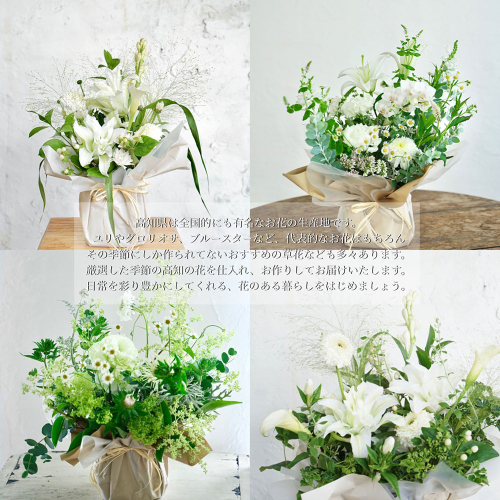 芸西村や高知で育てられた季節感あふれる旬の生花を中心に、ふんわり自然にいけたアレンジです。そのまま飾って頂けるデザインになっております。