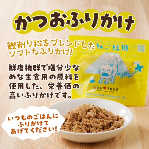 ねこ様用ふりかけ:粗たんぱく質30%以上、粗脂質0.6%以上、粗繊維0.2%以下、水分68%以下、粗灰分1.2%以下、食塩相当量0.2%以下