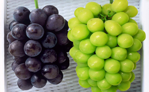 シャインマスカットは、大粒で甘味が強く、豊潤なマスカットの香りがする皮ごと食べられるぶどうです。ピオーネは果汁が多く、種無しで皮離れがよく、さわやかな甘酸っぱさが特徴です。どちらの品種も大人気の種無しぶどうです。