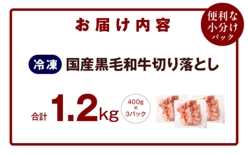 - 国産 黒毛和牛 切り落とし 合計1.2kg(400g×3パック)