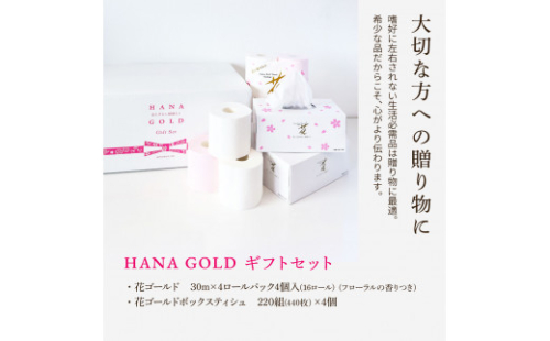 HANA Goldギフトセット トイレットペーパー 30m 16ロール 香り付き フローラルの香り 花柄 柄入り すかし模様 プリント ボックスティッシュ 220組 440枚 4個