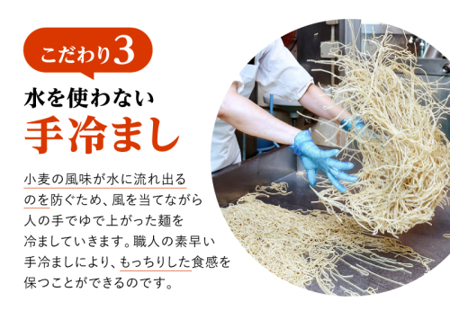 小麦粉の独自配合、生地づくり、成形、乾燥熟成、茹で上げ、粗熱とり、パッケージングといった一連の工程をすべて市内工場にて行った麺と独自配合した調味料です。